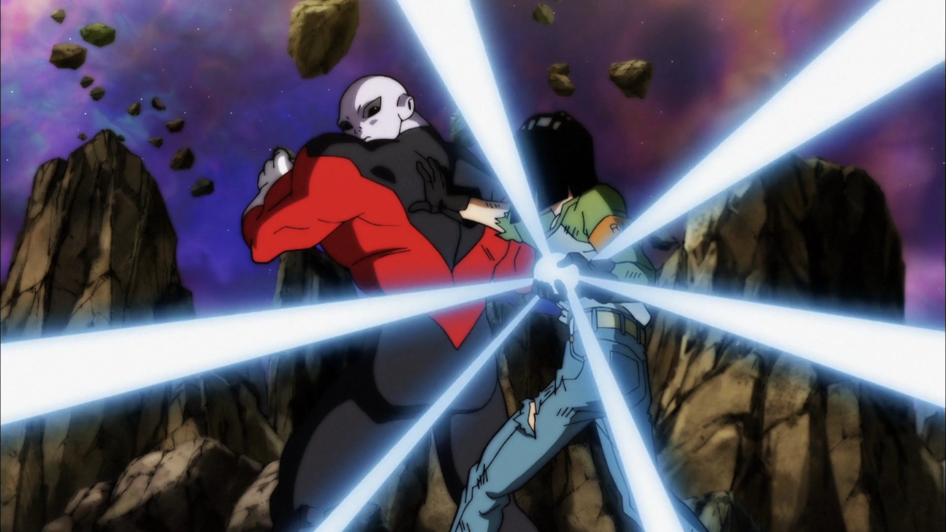 Número 17 lança raios de energia como suporte. Jiren se esquiva dos dois