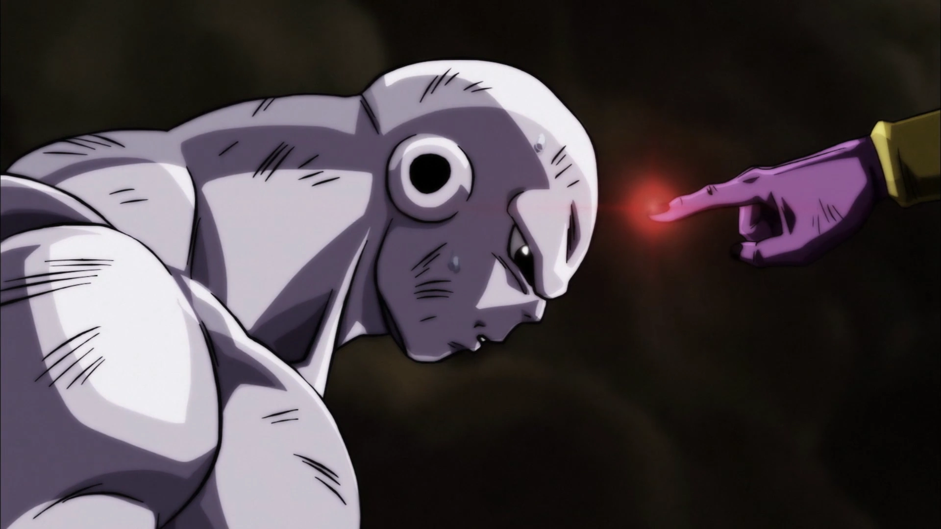 prepara um ataque atrás, mas Jiren percebe seu ataque e defende. Hit