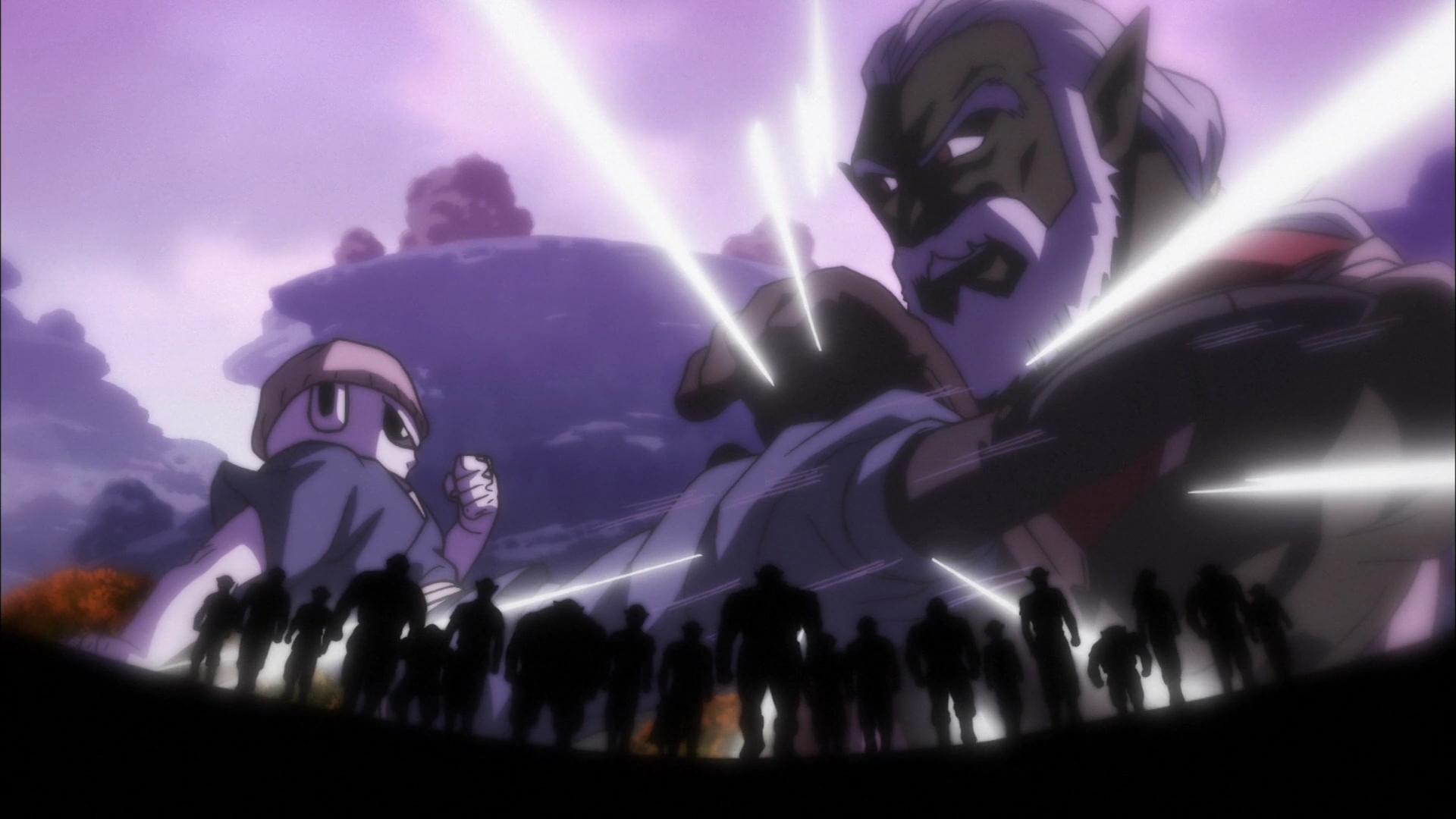 Jiren bloqueia, mas Hit o pega de surpresa e o golpeia no peito, lhe